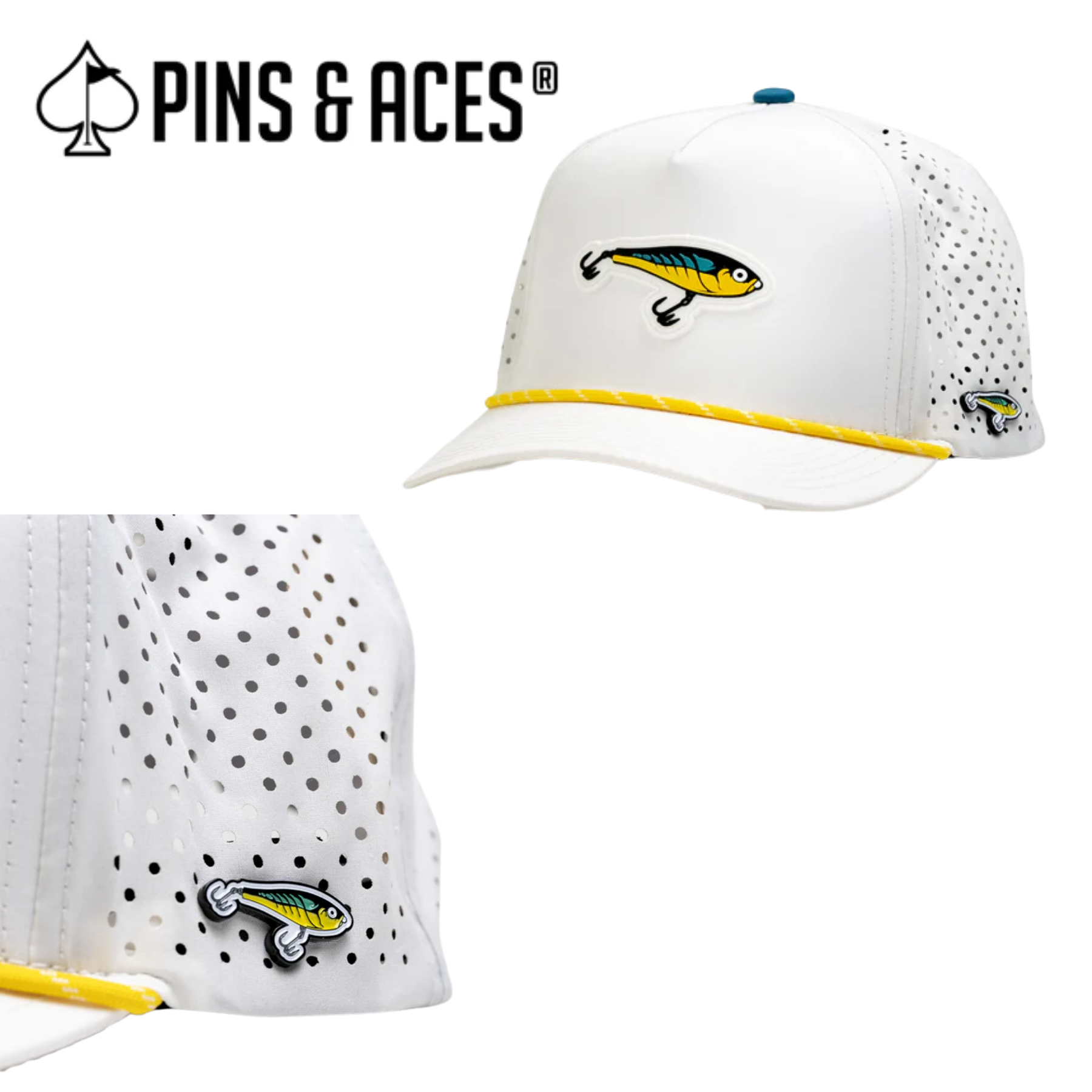 Pins & Aces: Fishing Lure White Snapback Hat & MATCHING Ball Marker